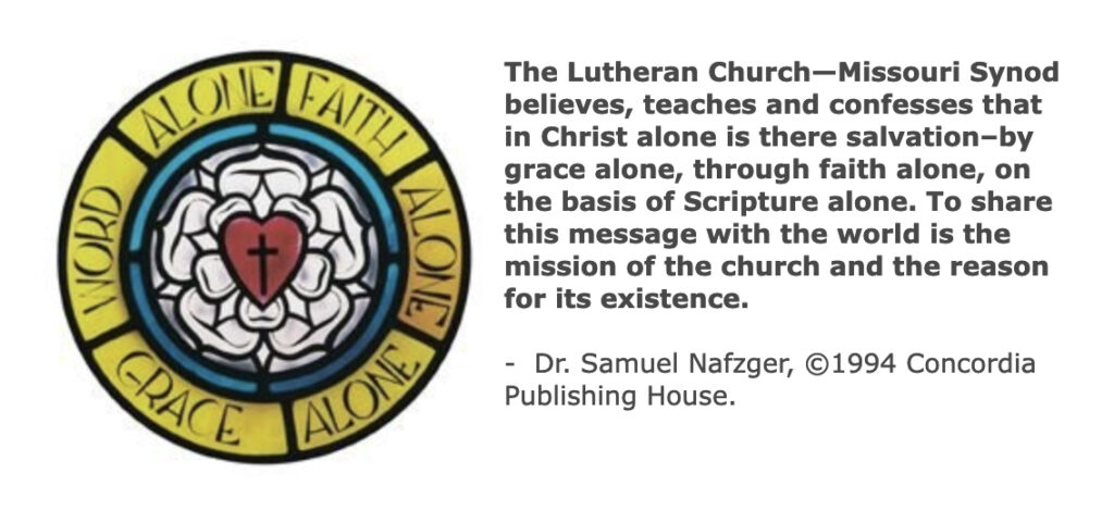 We accept and preach the Bible-based teachings of Martin Luther that inspired the reformation of the Christian Church in the 16th century. The teaching of Luther and the reformers can be summarized in three phrases: Grace alone, Faith alone, Scripture alone. We teach and respond to the love of the Triune God: The Father, creator of all that exists;  Jesus Christ, The Son, who became human to suffer and die for the sins of all human beings and to rise to life again in the ultimate victory over death and Satan; and  The Holy Spirit, who creates faith through God’s Word and Sacraments.  The three persons of the Trinity are coequal and coeternal, one God.  For more information on our belief and practice (goes to LCMS Website), please click here: